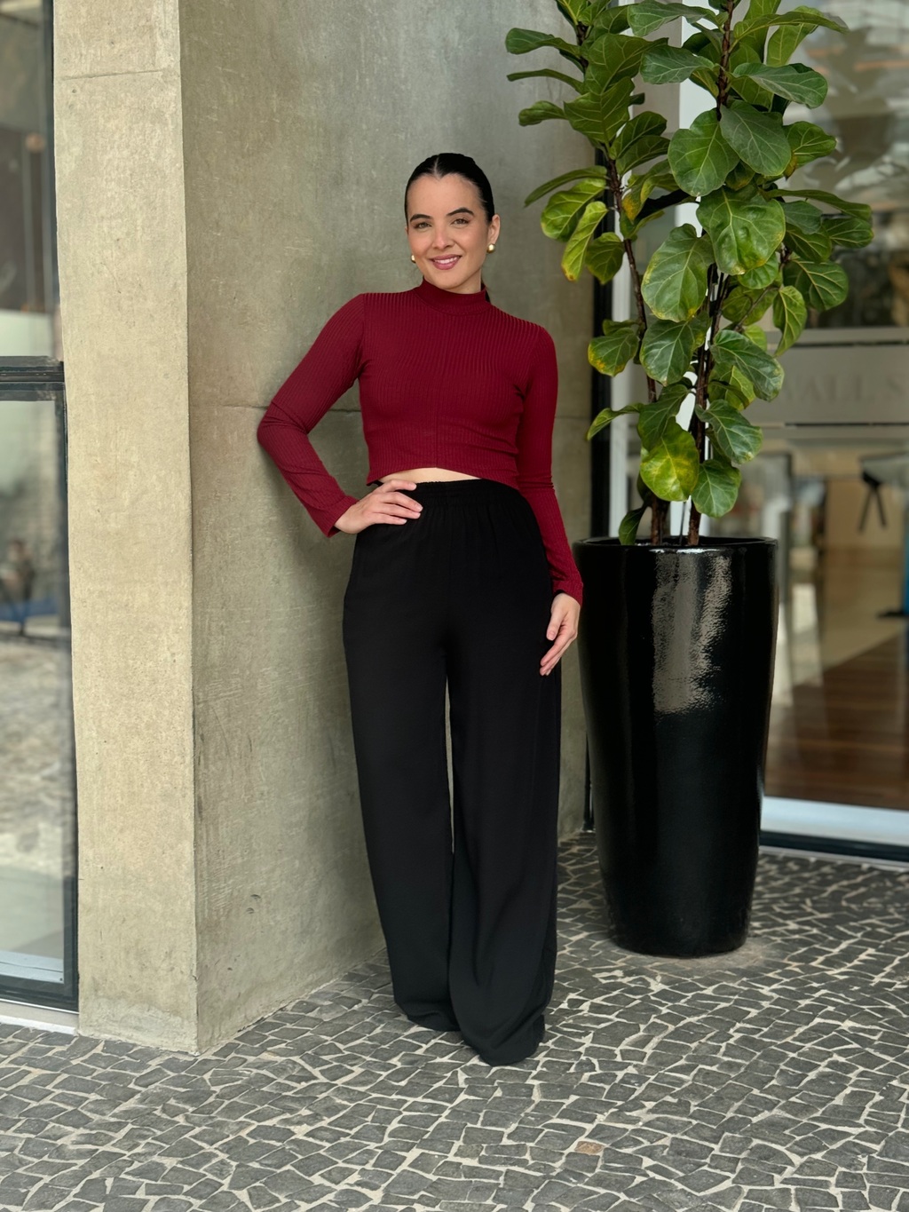 Um cropped perfeito pra compor looks incríveis! O recorte assimétrico na frente deixa pouca pele à mostra, fazendo com que o detalhe fique bem sutil e delicado. Em malha canelada à base de viscose, é muito confortável, tem um toque delicioso e é quentinho na medida. Possui mangas longas e gola alta.