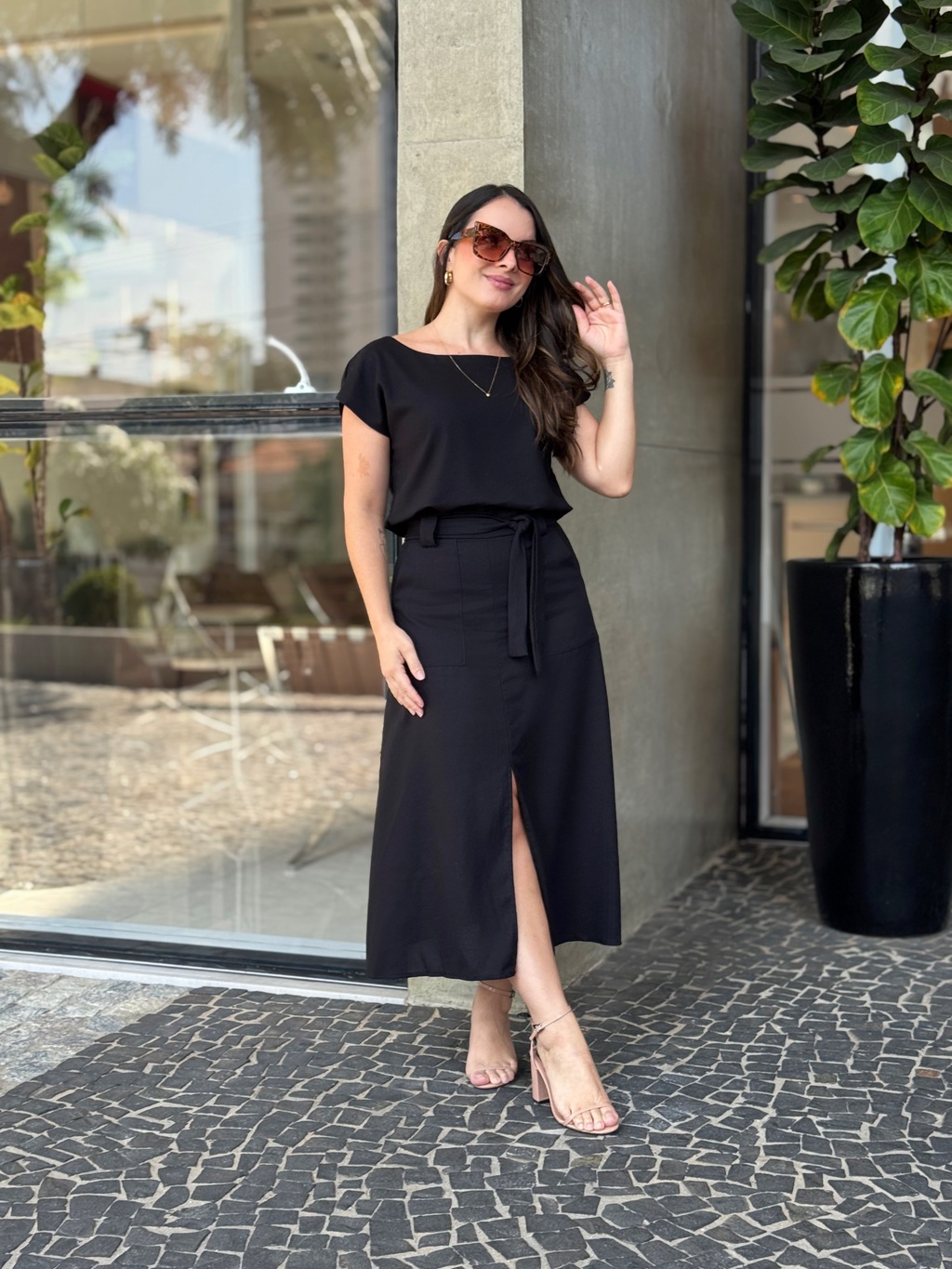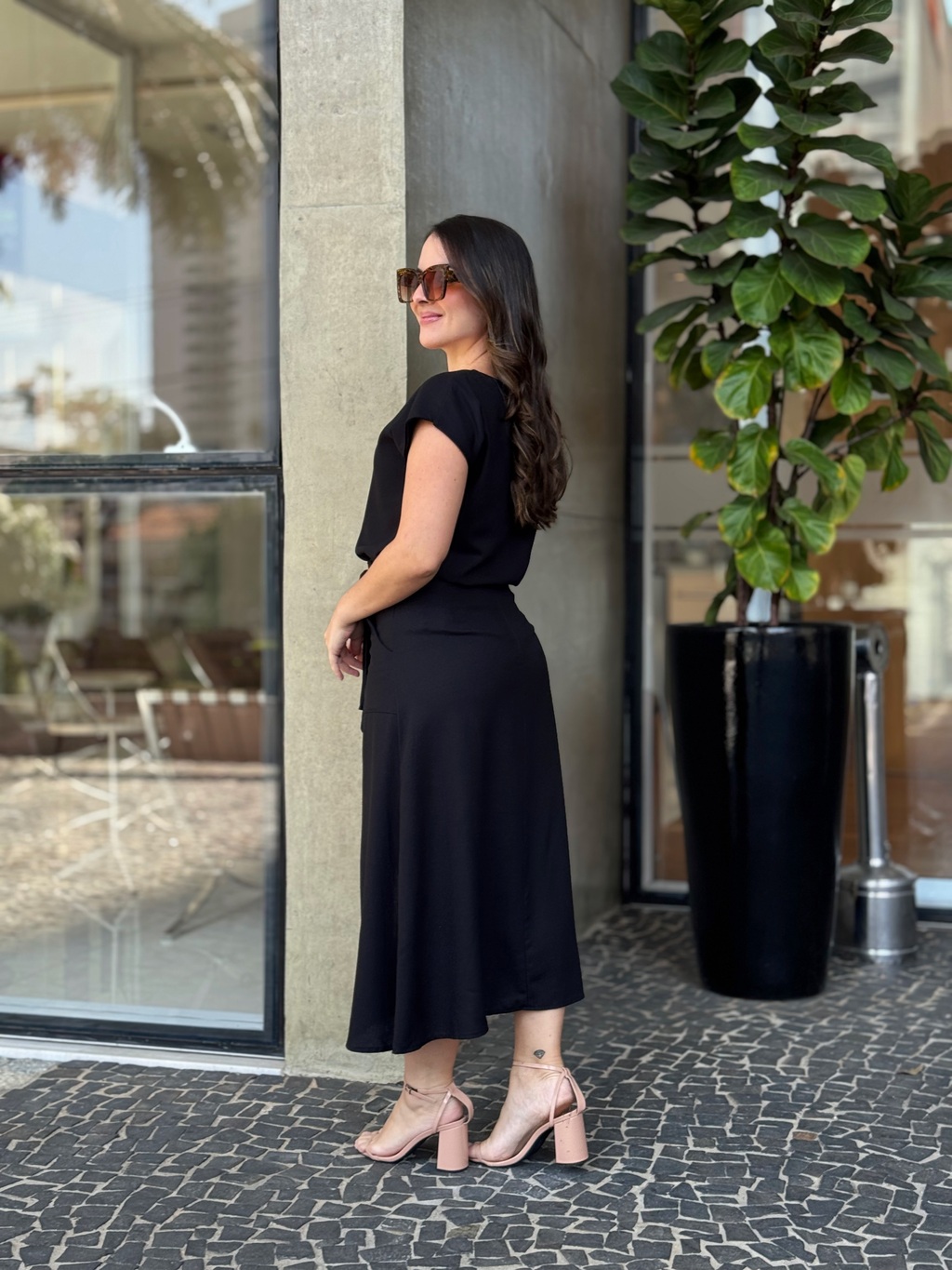 Uma saia midi cheia de detalhes especiais que deixam a produção mais interessante, e compõe um look super feminino e sofisticado.