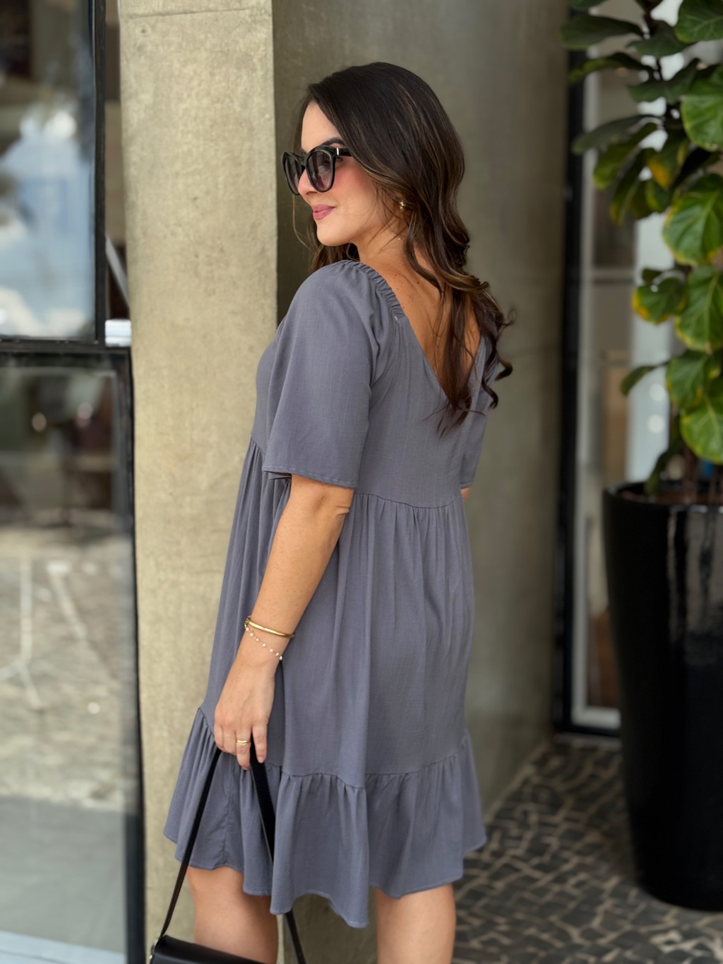 O detalhe franzido no busto valoriza o colo, formando um decote em V lindíssimo.